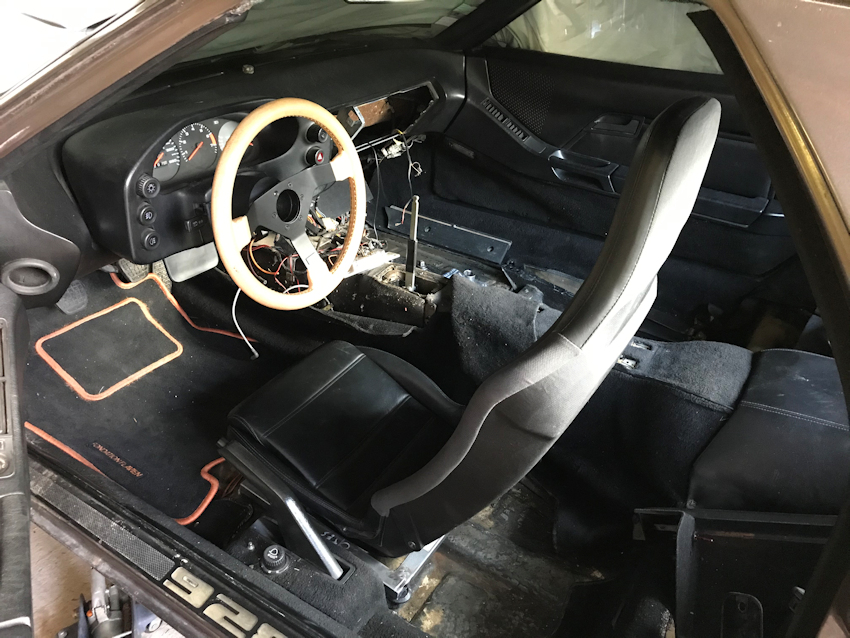 Les places arrières sont supprimées, le volant et les sièges d'origine sont vendus et ont désormais une deuxième vie sur une autre 928.